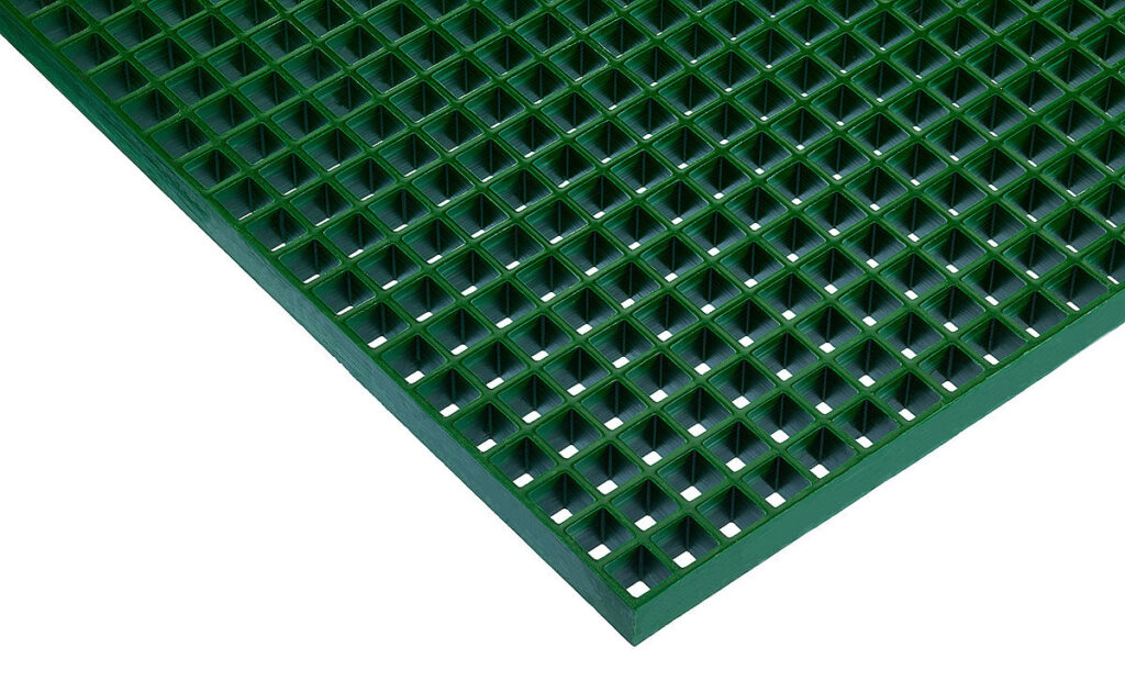 Food Grade GFK-Gitterroste verwenden einen speziellen Harz der bessere Eigenschaften für die Verwendung von GFK-Gitterrosten hat. Die Gitterroste zeichnen sich durch gute Chemikalienbeständigkeit und ein gutes Rutschhemmungsverhalten aus. Dennoch sollten die Gitterroste nicht im direkten Kontakt mit den Lebensmitteln verwendet werden.