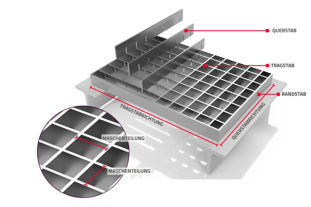 Vollroste werden in der Regel in einer Materialdicke von 2 mm und 3 mm bis zu einer max. Bauhöhe von 100 mm mit unterschiedlichsten Maschenteilungen hergestellt.