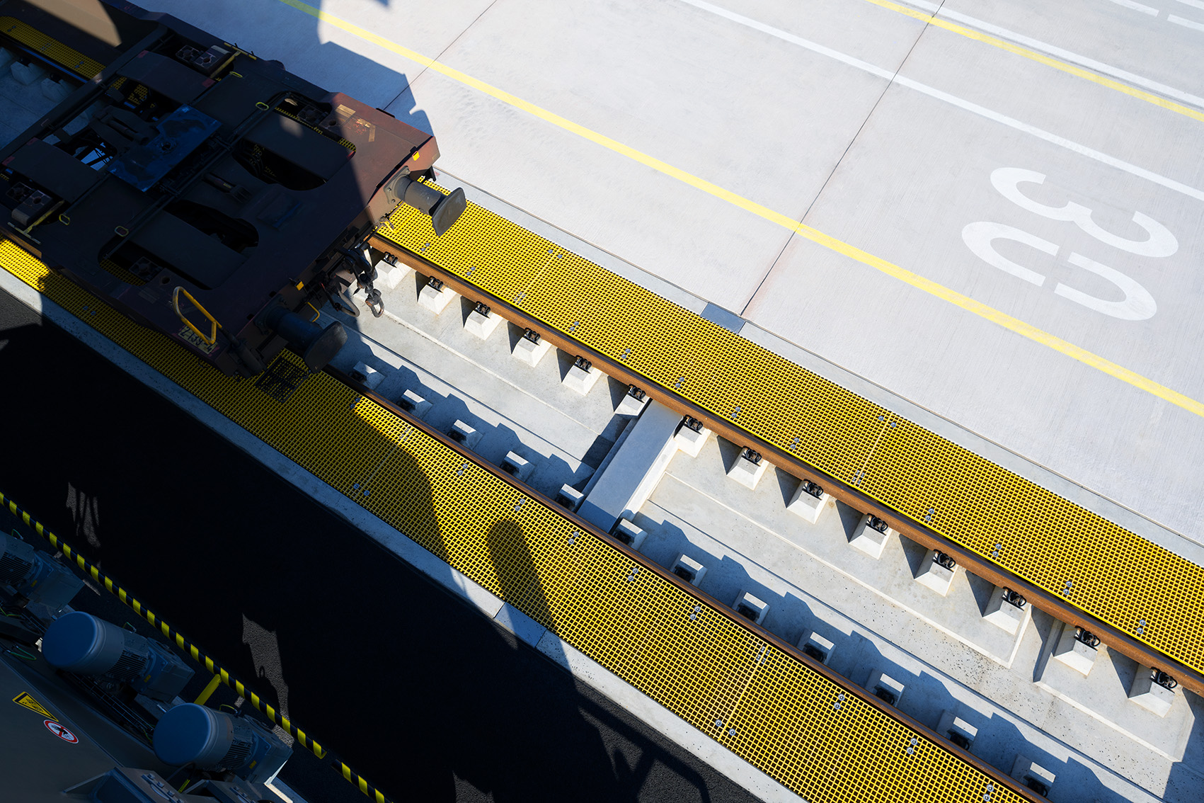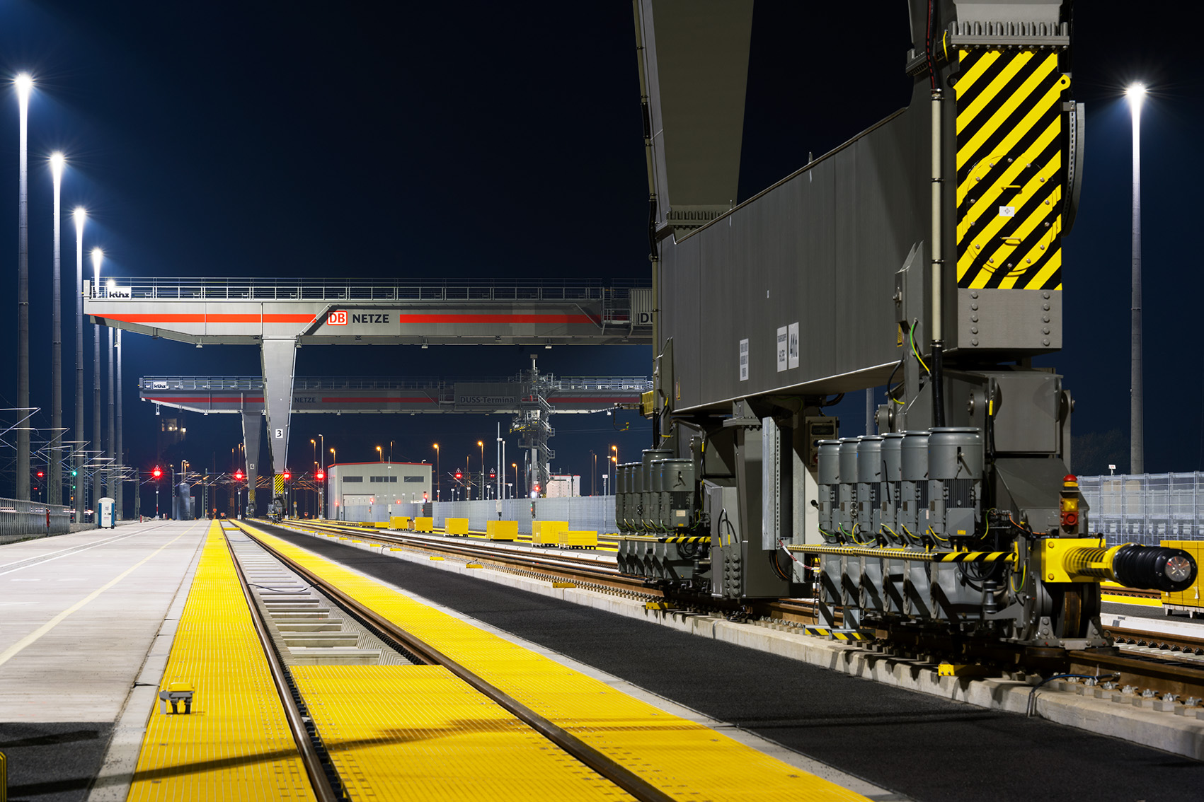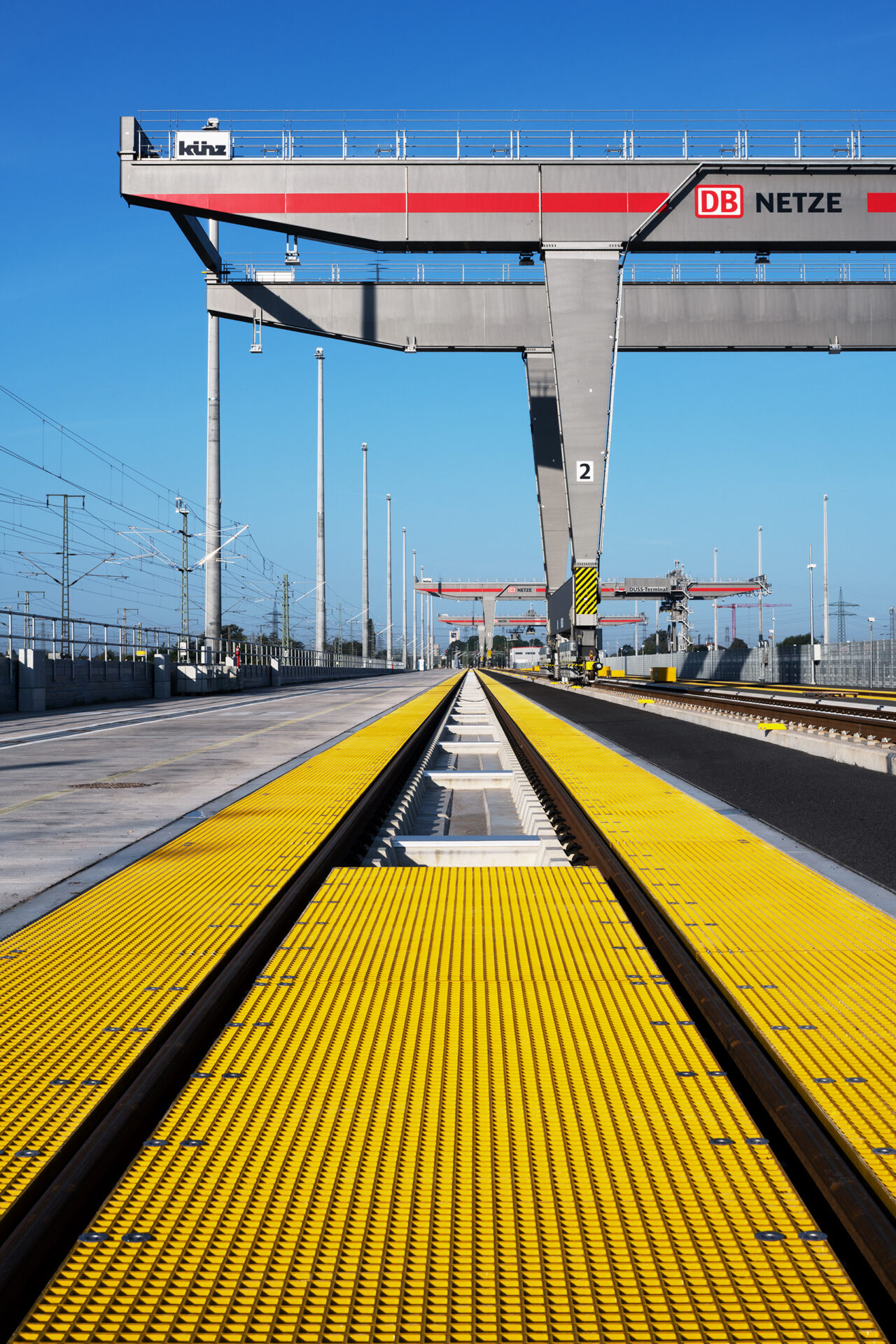 Auf dem Gelände des ehemaligen Rangierbahnhofs Lehrte wurde eine neue Schnellumschlaganlage, der MegaHub Lehrte, errichtet und wir sind mit unseren GFK-Produkten vertreten. Stützfüße aus GFK, dienen hier als Auflage der Gitterroste.